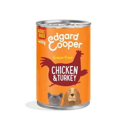 Edgard Cooper Huhn und Pute mit Apfel, Erdbeere und Karotte ist ein feuchtes Hundefutter mit viel magerem Huhn- und Putenfleisch .