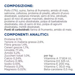 ZUSAMMENSETZUNG: Huhn (17%), Schweinefleisch, Weizenmehl, Maisstärke, Lachs, Zellulose, Erbsenprotein, dehydriertes Eiweiß, Mineralstoffe, Leinsamen, Hydrolysat, gemahlene Pekannussschalen, Maisdextrin, dehydriertes Schweineprotein, dehydrierte Rübenschnitzel, Leinöl, dehydrierte Zitrusschnitzel, dehydrierte Heidelbeeren. Kohlenhydratquellen: Weizenmehl, Maisstärke.