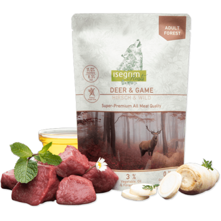 Isegrim Roots ist die ursprüngliche Ernährung des Vorfahren aller Hunde: des Wolfs. Rezepte mit einem unvergleichlichen Geschmack von natürlichen Zutaten, mit 97% frischem Fleisch, kombiniert mit vitaminreichem Gemüse, nahrhaften Ölen und ausgewählten Wildkräutern.