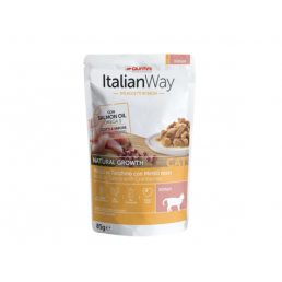 Italian Way for Kittens schmackhafte gedämpfte Filets in Sauce für heranwachsende Kätzchen bis zu 12 Monaten. Erhältlich in zwei leckeren Varianten: Lachs und Sanddorn Pute mit Preiselbeeren