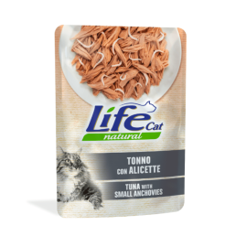 Life Cat Adult Nassfutter in Beuteln mit echten Fischscheiben und Fleischfilets. Alles gedämpft und in weichem Pflanzengelee konserviert. Ohne Farbstoffe, Konservierungsmittel oder Zusatzstoffe.