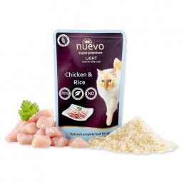 Nuevo Super Premium Paté Light & Senior Nassvollnahrung im Beutel. Natürliche Rezepturen für erwachsene Katzen mit Neigung zu Übergewicht oder ältere Katzen (über 7 Jahre) in einer köstlichen Pastete in Kochbrühe aus frischem Fleisch, Zutaten, die ursprünglich für den menschlichen Verzehr geeignet waren, frei von Gluten und Getreide, ideal auch für Katzen mit Diätproblemen.