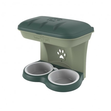 The Bama Food Stand kit consists of a double bowl with a storage compartment, which protects the bowls in case of rain, to be hung on the wall.
