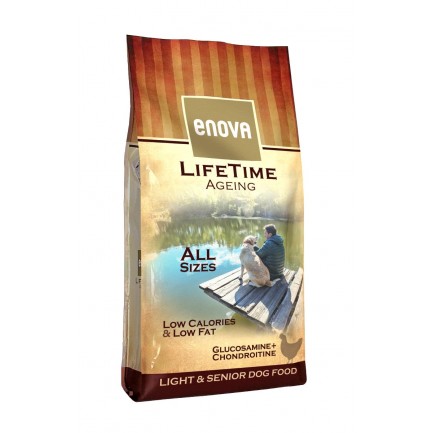 The recipe for Enova Lifetime Ag ing dog kibble is designed to provide low fat and calorie intake so as to promote weight loss while still ensuring perfectly balanced nutrition and remarkable palatability.