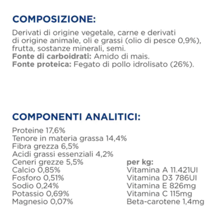 Original :Corn starch, hydrolyzed chicken liver, cellulose, minerals, soybean oil, animal fat, vitamins, trace elements, taurine, beta-carotene.With natural antioxidant (mixed tocopherols).