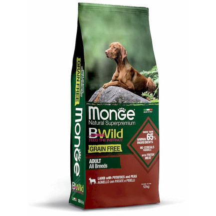 Monge BWild Grain Free Lamb with Potatoes and Peas is the dog kibble that provides the energy and essential nutrients to allow your dog to live by following his natural instincts.