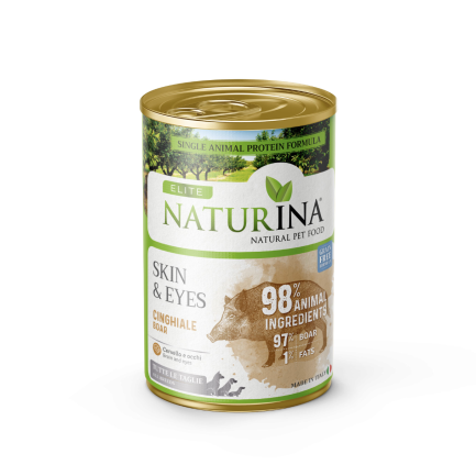 Skin & Eye Wild Boar and Blueberries is a soft, grain-free pate with a high content of wild boar (98%) as the only animal protein source. It contains an increased amount of salmon oil and sunflower seed oil, natural sources of Omega 3 and Omega 6 fatty acids, which are useful in keeping the coat shiny and bright and maintaining the physiological well-being of the retina.