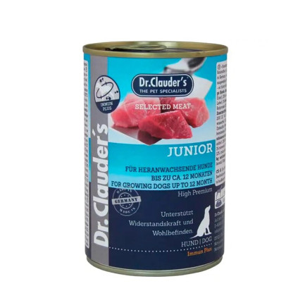 Dr.Clauder's Selected Meat Junior es un alimento húmedo completo para cachorros de hasta 12 meses de edad, con carne seleccionada de alta calidad, suavemente cocida al vapor.