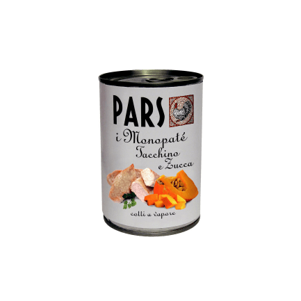 La comida húmeda Pars Monopaté Pavo y Calabaza para perros y gatos es un alimento complementario a base de pavo (100%) y calabaza (1% de calabaza deshidratada), cocido al vapor para preservar todos los nutrientes y las características más importantes de las materias primas.