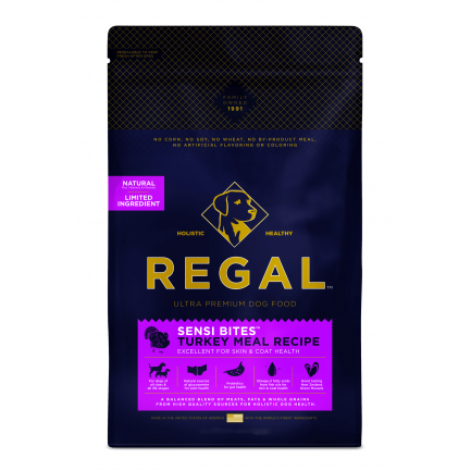 El pienso para perros Regal Sensi Bite Turkey Meal está formulado para satisfacer los niveles nutricionales establecidos por los Perfiles Nutricionales de Alimentos para Perros de la AAFCO para todas las etapas de la vida, incluido el crecimiento de perros de razas grandes (70 lbs. o más como adulto).