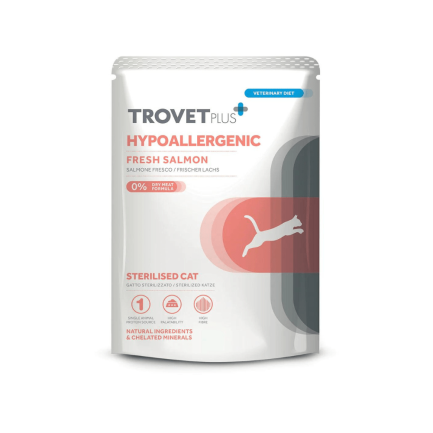 Trovet Plus Alimento húmedo completohipoalergénico para gatos tiene recetas de una sola proteína y es adecuado para gatos con cualquier tipo o gravedad de alergia alimentaria. La receta utiliza sólo carne, pescado y verduras frescas de la mejor calidad, no contiene harina de carne y, por lo tanto, es mucho más sabrosa y fácil de digerir para su gato.