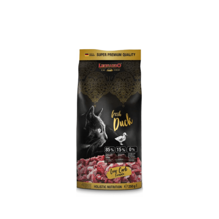 Les chats, en tant que carnivores, ne peuvent traiter l'amidon végétal qu'avec modération et seulement s'il s'agit de glucides décomposés. C'est pourquoi nous avons fourni au nouveau Leonardo Fresh Meat with Duck and Chicken beaucoup de protéines de haute qualité et de savoureuses sources de graisses animales.