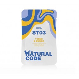 Natural Code Steril en sachet, trois recettes savoureuses et hypocaloriques idéales pour les chats stérilisés ou ayant tendance à l'embonpoint. Sans conservateurs, colorants et arômes.