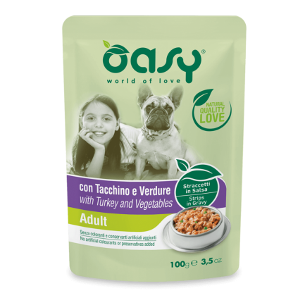 LesOasy Straccetti en Salsa sont de succulents restes de viande pour chiens. Disponible en 3 variantes - bœuf, dinde, saumon - et préparé avec des légumes dans une sauce délicate. Pour les chiens adultes de toutes tailles.
