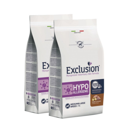 Exclusion Diet Hypoallergenic è una linea di alimenti per cani con un'unica fonte proteica animale e un uniaca fonte di carboidrati. Nelle formule, ipoallergeniche, si escludono le fonti di proteine che sono potenzialmente allergeniche, minimizzando il rischio di sensibilizzazione a più ingredienti.