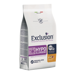 Exclusion Diet Hypoallergenic è una linea di alimenti per cani con un'unica fonte proteica animale e un uniaca fonte di carboidrati. Nelle formule, ipoallergeniche, si escludono le fonti di proteine che sono potenzialmente allergeniche, minimizzando il rischio di sensibilizzazione a più ingredienti.