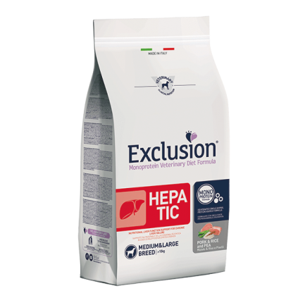 Exclusion Diet Hepatic Maiale e Riso per cani adulti di taglia media e grande è un alimento completo dietetico per cani adulti con insufficienza epatica cronica e per la riduzione del rame nel fegato.
