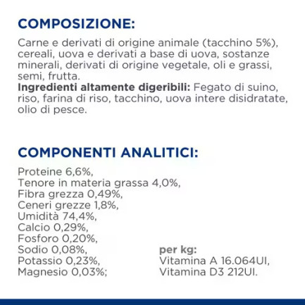 COMPOSIZIONE: Carne e derivati di origine animale (tacchino 5%), cereali, uova e derivati a base di uova, sostanze minerali, derivati di origine vegetale, oli e grassi, semi, frutta. Ingredienti altamente digeribili: fegato di suino, riso, farina di riso, tacchino, uova intere disidratate, olio di pesce.