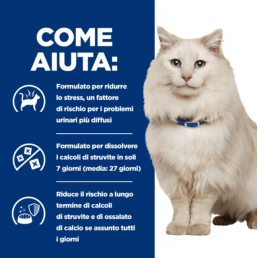 Hill's Prescription Diet c/d Multicare Stress ha proprietà di sottosaturazione urinaria per la struvite, proprietà alcalinizzanti le urine e contiene un basso livello di magnesio, calcio e vitamina D.