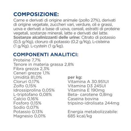 COMPOSIZIONE: Carne e derivati di origine animale (pollo 27%), derivati di origine vegetale, zuccheri vari, verdure, oli e grassi, uova e derivati dell'uovo, cereali, estratti proteici vegetali, minerali, latte e derivati del latte. Sostanze alcalinizzanti le urine: Citrato di potassio (0,5 g/kg), cloruro di potassio (0,2 g/kg), L-cisteina (1 g/kg).