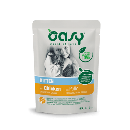 Oasy Kitten Bocconcini in Salsa con Pollo è un alimento completo per gattini da 1 a 12 mesi