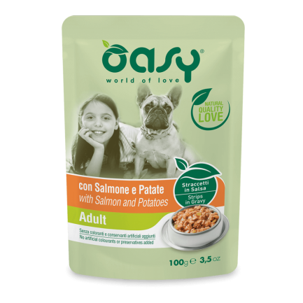 Oasy Straccetti in Salsa sono succulenti straccetti di carne per cani. Disponibili in 3 varianti – manzo, tacchino, salmone – e preparati con verdure in delicata salsa. Per cani adulti di tutte le taglie.