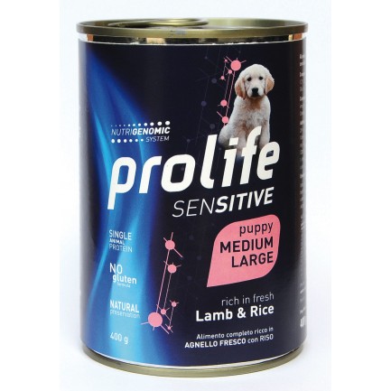 Prolife Puppy Sentitive con Agnello e Riso è un alimento umido per cuccioli in dai 2 ai 12 mesi.L'agnello come unica fonte proteica animale e il riso come unica fonte di carboidrati rendono questo cibo umido per cani cuccioli leggero e digeribile, ideale per cuccioli con sensibilità digestiva.