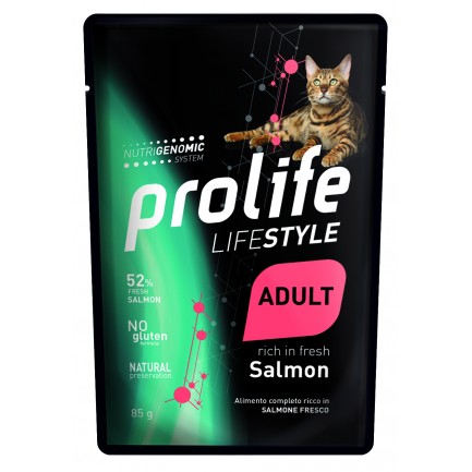Prolife Life Style Adult Salmon è un alimento umido completo per gatti di adulti di tutte le taglie, ricco in salmone fresco.