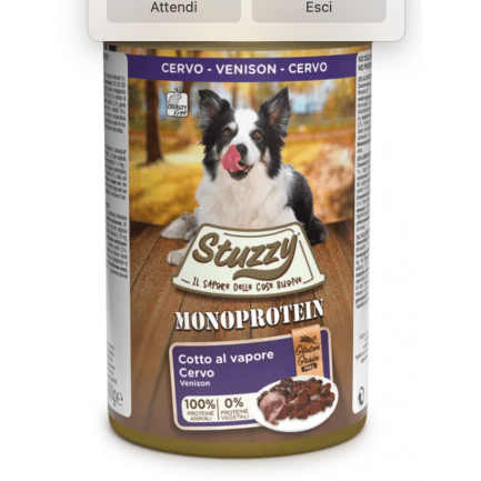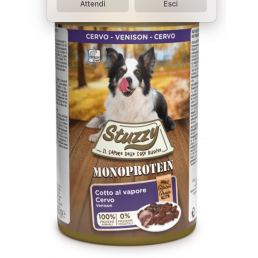 La ricetta delle lattine monoproteiche per cani Stuzzy Monoprotein Adult Dog è priva di cereali e quindi senza glutine.