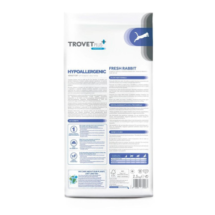 Trovet Hypoallergenic al Coniglio è specificatamente formulato come alimento completo dietetico ipoallergenico per gatti affetti da sintomi di ipersensibilità alimentare. La ricetta è basata su un'unica proteina animale (coniglio) e un'unica fonte di carboidrati (riso).