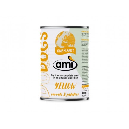 Ami'Yellow Vegetable Wet Dog Food to alternatywa lub uzupełnienie krokietów w codziennej diecie psa, odpowiednia dla psów na diecie opartej na białkach roślinnych.