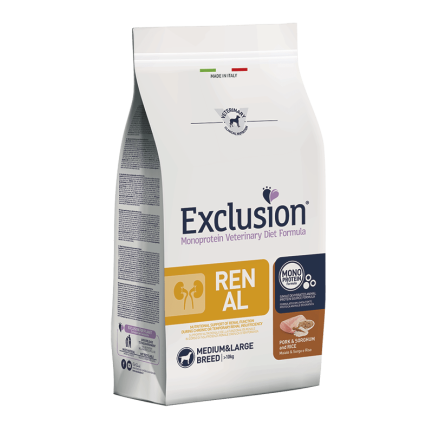 Exclusion Monoprotein Veterinary Diet Formula Renal to pełnoporcjowa sucha karma dietetyczna w postaci krokietów z jednobiałkową formułą dla psów z niewydolnością nerek.