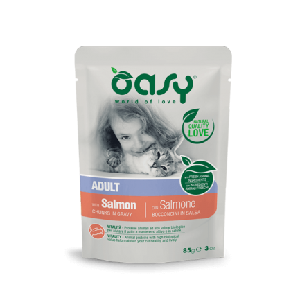 Oasy Adult Chunks in Sauce to pełnoporcjowa karma stworzona ze świeżego mięsa i naturalnych składników, aby zapewnić maksymalny smak i zaspokoić specyficzne potrzeby kota w zależności od wieku i stylu życia.