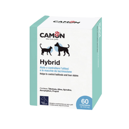 Hybrid nadaje się nie tylko do zwalczania skazy białej sierści, ale jest również cennym narzędziem, dzięki obecności wodorostów, takich jak Spirulina, do kontrolowania halitozy u psów i kotów wszystkich ras.
