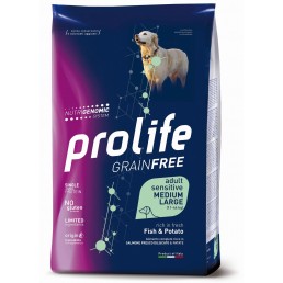 Prolife Sensitive Grain Free Medium and Large Fish and Potatoes to pełnoporcjowa sucha karma dla psów opracowana z myślą o specyficznych potrzebach dorosłych psów średnich i dużych ras z nadwrażliwością układu pokarmowego, stawów lub skóry.