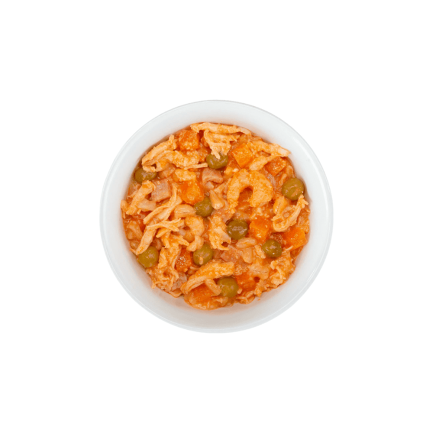 kurczak 41%, rosół z kurczaka 31%, czerwony brązowy ryż 10%, marchew 4%, pomidor 4%, pasta pomidorowa 4%, minerały, rafinowany olej słonecznikowy, skrobia z tapioki, kurkuma w proszku 0,05%, imbir w proszku 0,05%, olej z tuńczyka.